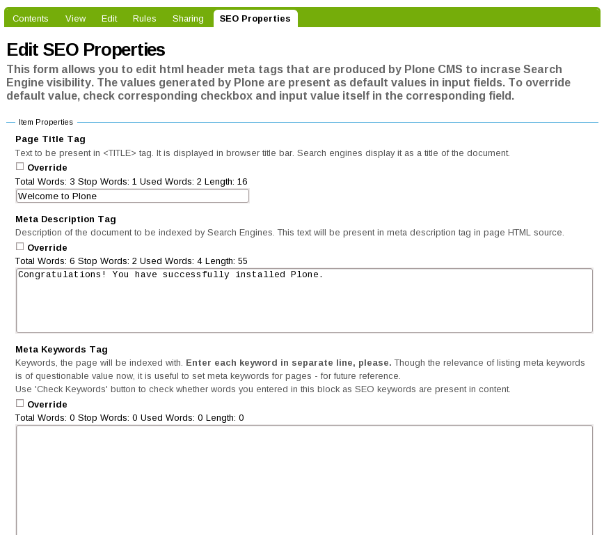 Plone SEO allows per document editing of such document SEO properties as: HTML Title tag, META description tag, META keywords tag, HTML comment into page header, META robots tag, META Disposition tag, Canonical URL. For title, description, and keywords tags you have statistics (total/stop/used words, field length counter).