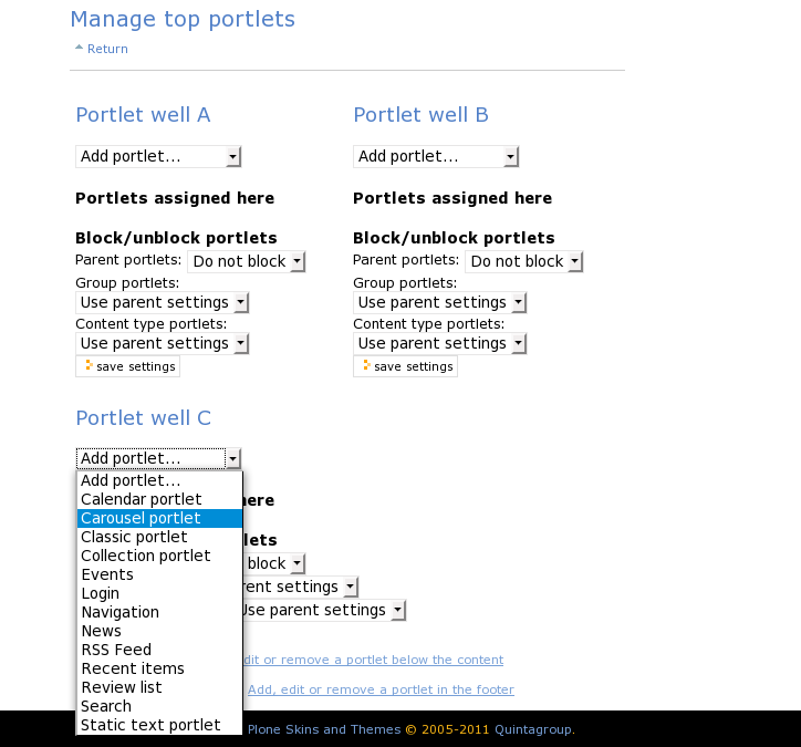 You will see 3 portlet columns: Portlet well A, Portlet well B, and Portlet well C. You can hide existing portlets from display or remove them and add new any types of portlet into these columns.