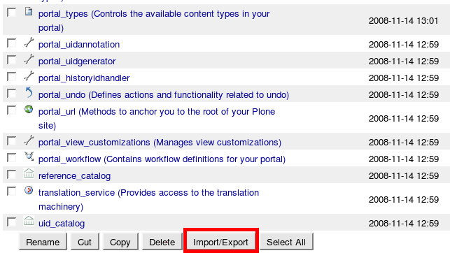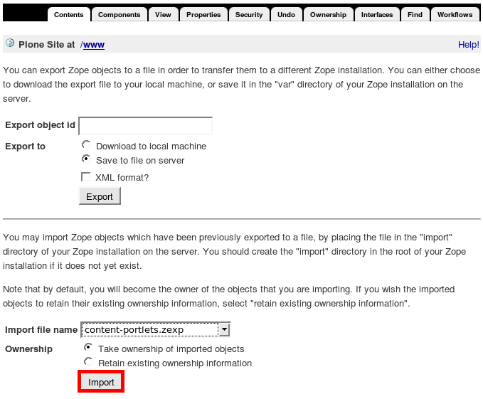 - Go to Zope Management Interface of your Plone site. Move to the bottom of the page to see Import/Export button. Click on it.