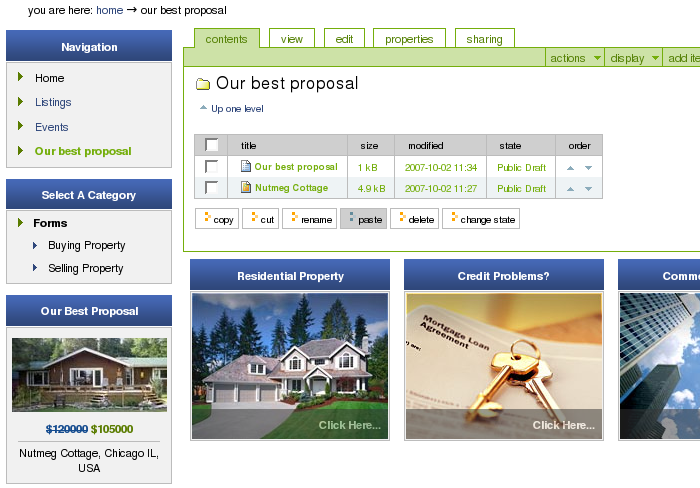 Real Estate Company front page displays news items published on the site. They are gathered by News smart folder. To get the News smart folder content to be the on the front page, we've used the display menu on the portal root. We clicked select a content item as default view...: